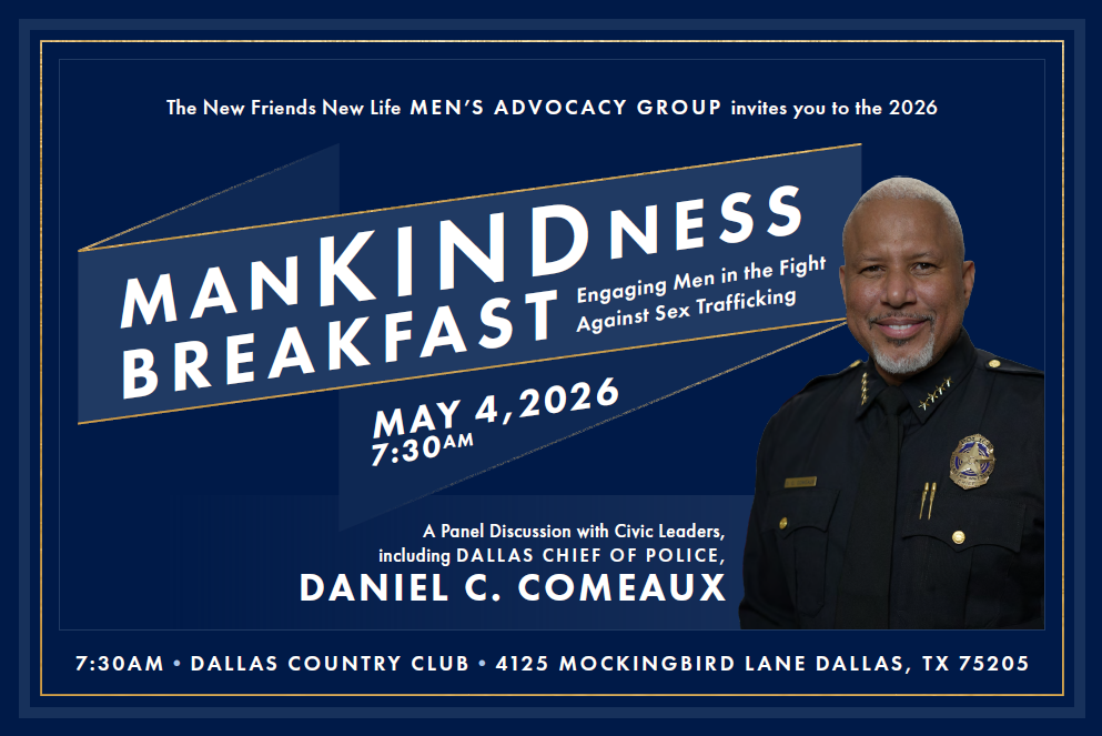 The Men’s Advocacy Group (MAG) is an auxiliary of New Friends New Life, created to mobilize men to take action against sex trafficking and exploitation by raising awareness through advocacy, education, and volunteerism.